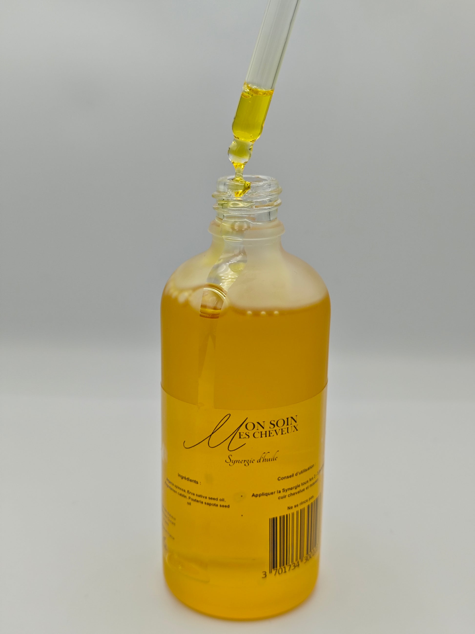 Explosion d’huile fortifiante pour favoriser la pousse. Cette synergie à pour but de redonner de l'éclat aux cheveux grâce à l’huile d’Argan, l'huile de Roquette va fortifier le cheveux, le rendre soyeux et nourrit et va éviter les fourches ainsi que la casse. Grâce aux Acide gras Oméga 6 et 9, la synergie boostera la prolifération des follicules capillaires de plus les acide gras sont un embellisseur. Elle régénère et purifie vos cheveux. Sans parler de l'odeur qui est très agréable.